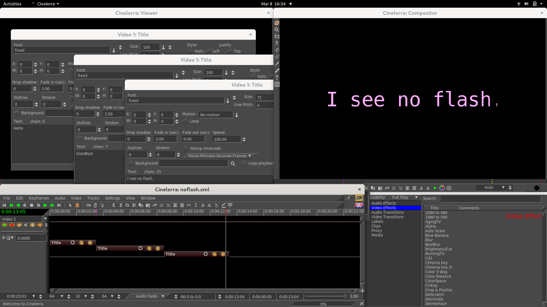 Camille, A Freelancer has provided a fix for the fade bug in Title plugin and the Dissolve transition BUT I can not tell for sure if it is a correct fix (seems to work on Fedora O/S with your black flash demo). I have asked IgorBeg to test if he has time. A little more information is in BT #559.