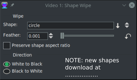 Andrew and RafaMar: The Manual has been updated to include the fact that the 63 ShapeWipe transitions are now jpegs and if for some reason a user needs a png quality transition instead, to download them and untar from: https://cinelerra-gg.org/download/testing/ShapeWipe_pngs.txz