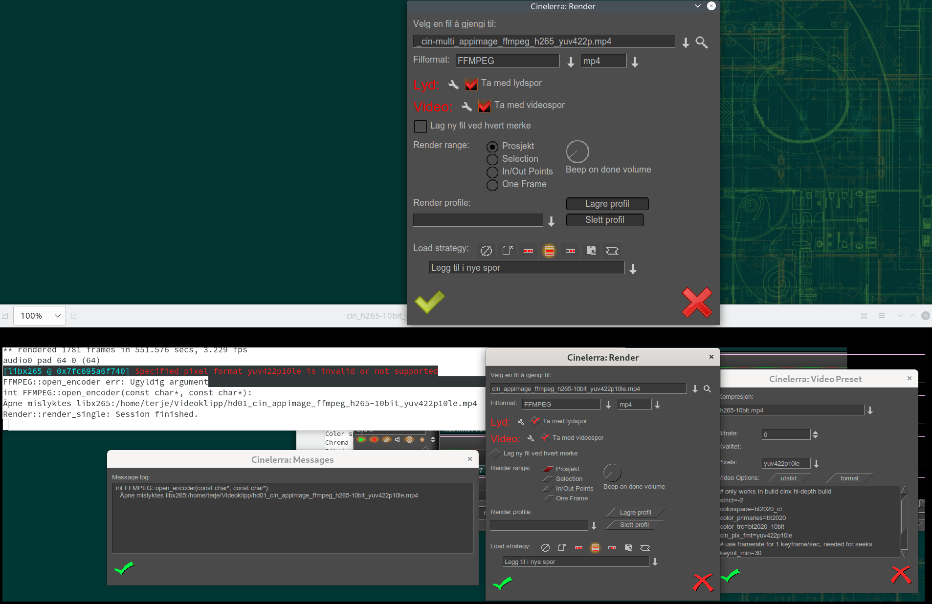 @Andrew Thx, that's right - I don't know why or how the Render "Make new file box" was checked on my MSI workstation. Unchecked it and the above file rendered ok. A minor visual notice, why differ the Render button geometries between my two workstations with the same, latest Cin-GG appimage installation? See the attached screenshot, the top Render window with square and round buttons vs the bottom Render window with romb buttons. One render option combination that Cin-gg regular reported error message (invalid or not supported), was as shown on the screenshot h265-10bit.mp4 compression and yuv422p10le pixels Is this correct? @Andrea I succeeded to rendered further combinations and cleaned up my file name syntax as follows: du -sh hd01.mov hd01*app*.mp4 1,7G hd01.mov (input 10bit ProRes HQ file) -------------------------- 70M hd01_cin_appimage_ffmpeg_h264-10bit_yuv422p10le.mp4 72M hd01_cin_appimage_ffmpeg_h264_yuv420p.mp4 80M hd01_cin_appimage_ffmpeg_h264_yuv422p10le.mp4 82M hd01_cin_appimage_ffmpeg_h264_yuv422p.mp4 0 hd01_cin_appimage_ffmpeg_h265-10bit_yuv422p10le.mp4 (failed) 26M hd01_cin_appimage_ffmpeg_h265-10bit_yuv422p.mp4 26M hd01_cin_appimage_ffmpeg_h265_yuv422p.mp4 -------------------------- 26M hd01_cin-multi_appimage_ffmpeg_h265-10bit_yuv422p10le.mp4 26M hd01_cin-multi_appimage_ffmpeg_h265-12bit_yuv422p12le.mp4 26M hd01_cin-multi_appimage_ffmpeg_h265_yuv422p10le.mp4 26M hd01_cin-multi_appimage_ffmpeg_h265_yuv422p.mp4 @"Manual" I think it could be useful if it is possible to add some overview table(s) i.e in the manual section FFmpeg Format Options inside CINELERRA-GG: That is, valid and Standard Profiles with Compression and Pixels properties for actual purposes and media, that works for Cin-GG and Cin-GG multibit respectively? ----------------- Terje J. H