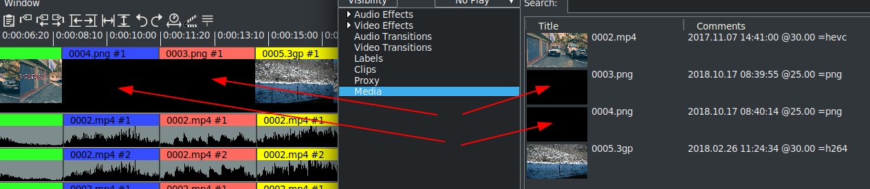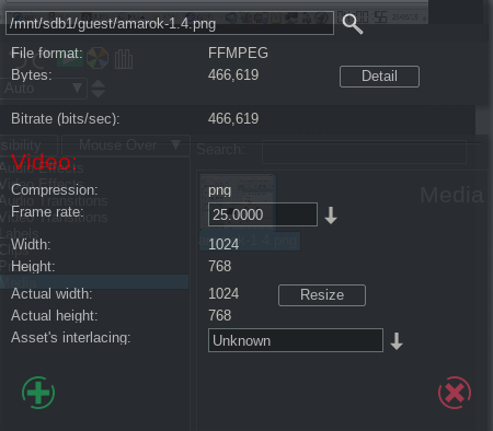 With the last git I can no longer see the png. Both in resources and timeline are not seen. In the terminal I have the following messages: Cinelerra Infinity - built: Dec 2 2020 10:36:34 git://git.cinelerra-gg.org/goodguy/cinelerra.git (c) 2006-2019 Heroine Virtual Ltd. by Adam Williams 2007-2020 mods for Cinelerra-GG by W.P.Morrow aka goodguy Cinelerra is free software, covered by the GNU General Public License, and you are welcome to change it and/or distribute copies of it under certain conditions. There is absolutely no warranty for Cinelerra. sample_aspect_ratio, 1.000000 display_aspect_ratio, 1.777778 ff_aspect_ratio, 1.777778 interlace from demux: 0 sample_aspect_ratio, 1.000000 display_aspect_ratio, 1.777778 ff_aspect_ratio, 1.777778 interlace from demux: 0 sample_aspect_ratio, 1.000000 display_aspect_ratio, 1.777778 ff_aspect_ratio, 1.777778 FFMPEG::open_decoder: some stream have bad times: /home/paz/video_editing/prova/1080/0003.png ff_aspect_ratio, 0.000000 interlace from demux: 0 FFMPEG::open_decoder: some stream have bad times: /home/paz/video_editing/prova/1080/0004.png ff_aspect_ratio, 0.000000 interlace from demux: 0 sample_aspect_ratio, 1.000000 display_aspect_ratio, 1.777778 ff_aspect_ratio, 1.777778 interlace from demux: 0 sample_aspect_ratio, 1.000000 display_aspect_ratio, 1.777778 ff_aspect_ratio, 1.777778 The error "some stream have bad times:" always gave it to me, but the pngs saw the same. EDIT: the same problem with jpg. An animated gif works.