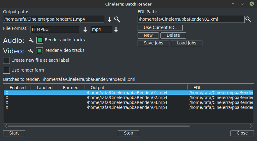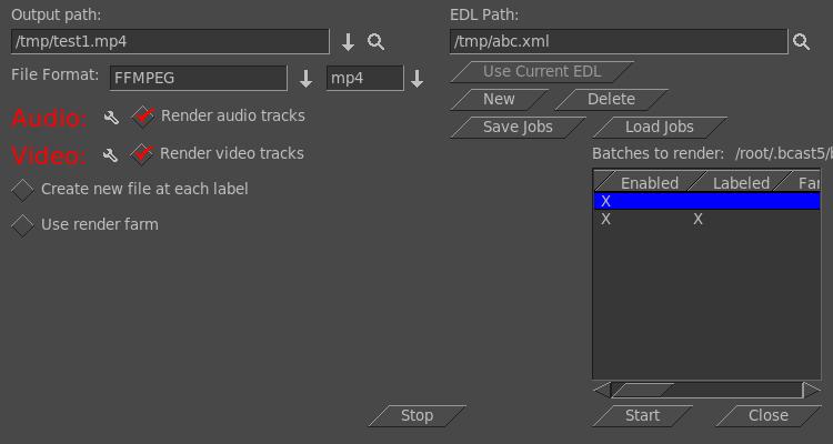 The batch render window is true that it is not very intuitive, but once we know that each new line that we want to add, we must first use the "New" button, with this data it is already perfect, except for two options that I will comment below. Two options that in my point of view do not make any sense in this assistant. One of these options in the "Save to EDL Path" option is the first time I have seen this option to save the open project in a batch render window, but it can ruin our work. Let me explain, a batch render is normally prepared with the application without any project loaded. Imagine that you have just loaded in "EDL Path" the path of a project file that has taken you months of work, and of which you do not have a backup copy. And by mistake you click on this button ... you have just lost all your work and there is no going back. I find this button a bad joke, so dangerous, meaningless and with disastrous consequences. I would ask that it be removed, because it is not useful or logical and can also frustrate many hours of work. Another option that doesn't make sense in the "warn if jobs/session mismatched" option. Let me explain, normally when we program a batch render we do it to export different projects, so that these are carried out automatically at times when we do not need to use the computer. This option sometimes seems to be disabled, but it is not, despite the apparently inactive button, it is active and when we try to start the batch rendering we get the error "# job EDLs do not match session edl". It is true that a batch render can be done from a single project to export it in different formats, but even so, I don't see any sense, because when we program this batch render we do it from an .xml project file, already saved, without the need for it to be loaded into the project. I honestly think this window would be much better without these options. I don't know how to program, but I think these changes are very easy to make. I open this debate in order to improve the experience with Cinelerra, an editor that I really like, but that is sometimes a little overshadowed by these details.