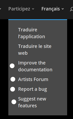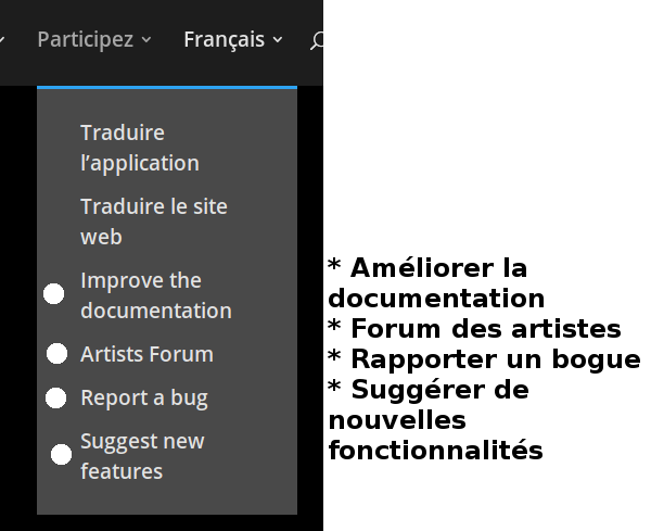 Image 3: * Improve the documentation -> améliorer la documentation * Artists forum -> Forum des artistes * Report a bug -> Rapporter un bogue * Suggest new features -> Suggérer de nouvelles fonctionnalités