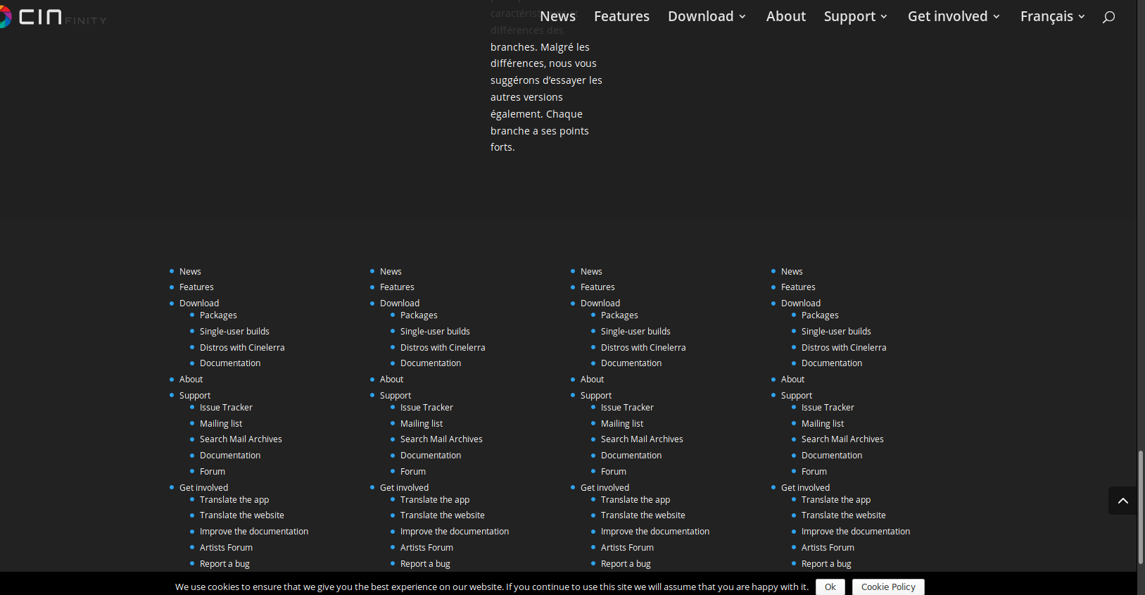 you might actually prefer to copy/paste, so: Image 1: * Packages -> Paquets * Single-user builds -> Constructions mono-utilisateur (note: better translation than the one in the picture) * Distros with Cinelerra -> Distros avec Cinelerra Image 2: * Issue Tracker -> Suivi des problèmes * Mailing list -> Liste de diffusion Image 3: * Improve the documentation -> améliorer la documentation * Artists forum -> Forum des artistes * Report a bug -> Rapporter un bogue * Suggest new features -> Suggérer de nouvelles fonctionnalités Image 5: * Home -> Accueil * Privacy policy -> Politique de confidentialité * Cookie policy -> Politique de cookie * Get help (issue tracker) -> Obtenir de l'aide (suivi des problèmes) * Get in touch with us (mailing list) -> Nous contacter (liste de diffusion) * Improve the documentation -> améliorer la documentation * Artists forum -> Forum des artistes * Report a bug -> Rapporter un bogue * Suggest new features -> Suggérer de nouvelles fonctionnalités (note: better translation than the one in the picture)