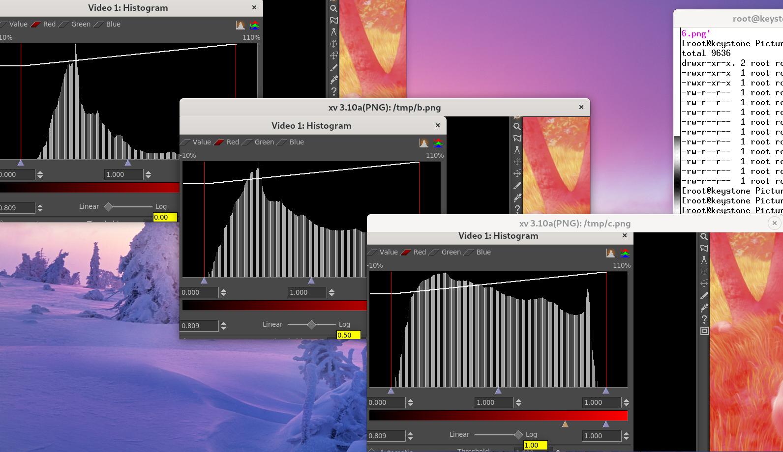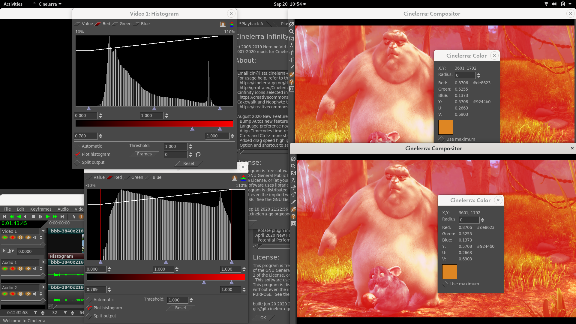 @Igor BEGHETTO <igorbeg@visi1.org> Yes, Yes, I can. See the attached png file. Note that the project was created from a June 20, 2020 build (see the bottom section) and the project was loaded on a build of September 18. The color picker in the Compositor shows the exact same value and the image colors look equivalent. Of note though is that the "Linear to Log Slider" will look different until you slide it all the way to LOG which is what it was in the original Histogram. Adding the Linear and the percentages for sliding provides the capability to see a more versatile histogram. GG says something about the lower colors are washed out of the histogram or the higher colors are too prevalent when using LOG (this is probably quoted wrong) -- that is why it is set to the default of 50% until you change it. Note, that for illustrative purposes I have the slider set to LINEAR. On Sun, Sep 20, 2020 at 1:46 AM Igor BEGHETTO via Cin < cin@lists.cinelerra-gg.org> wrote: