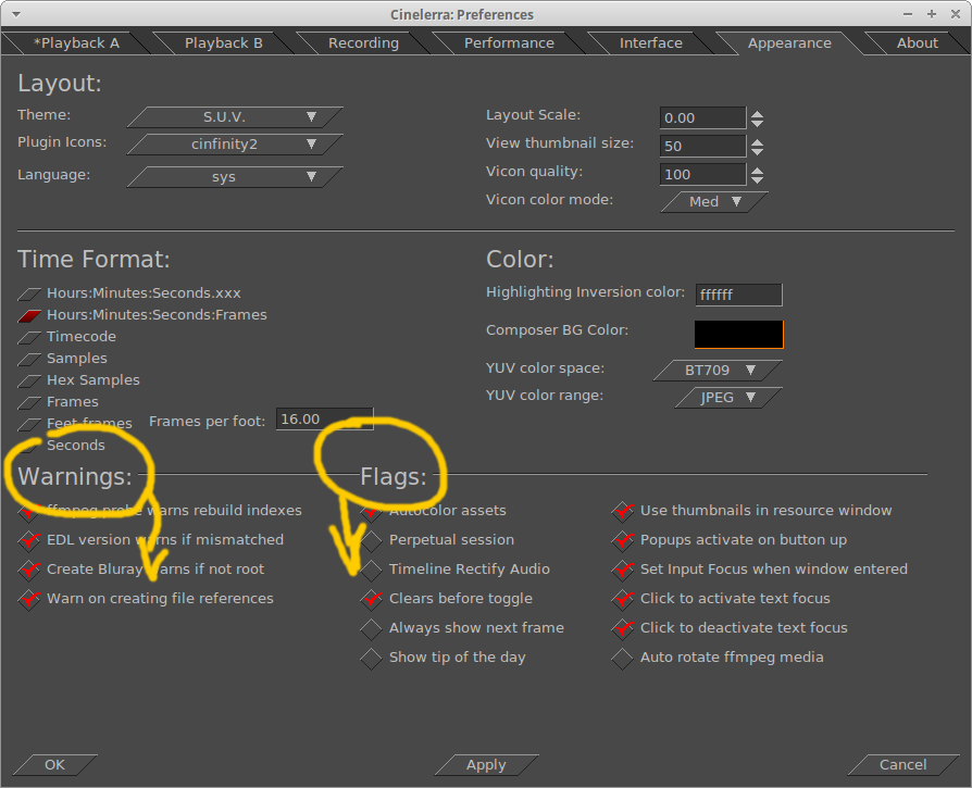 - Preferences window, Appearance tab (Cin_20200923_d2_PreferencesAppearance.png): the texts "Warnings" and "Flags" are in a wrong place. They should be under the line.