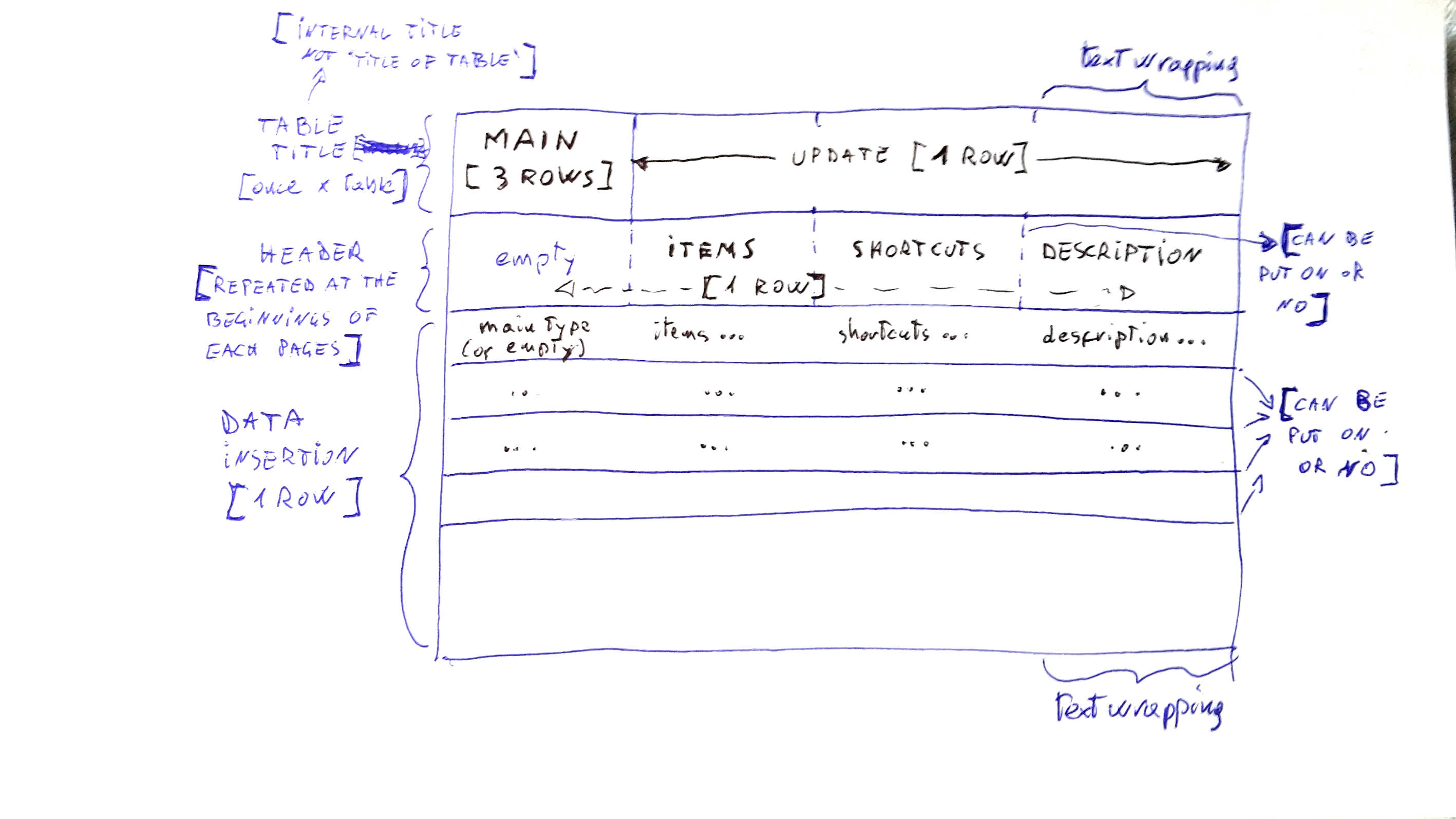 Despite the praise I've given you above, I'm too ignorant to be able to make a table for the Shortcuts :-) I've tried to study and adapt your examples, but I don't get usable results. I would need a structure like the one I show in the attached image (slightly modified from the table in the manual, because it contains errors). Another important question: [we talked about it some time ago, but I'm afraid I need detailed explanations] Come can I enter the huge amount of data in the libreoffice table as automatically as possible, instead of writing cell by cell? I tried to save the table in CSV, but I don't know how to do it.