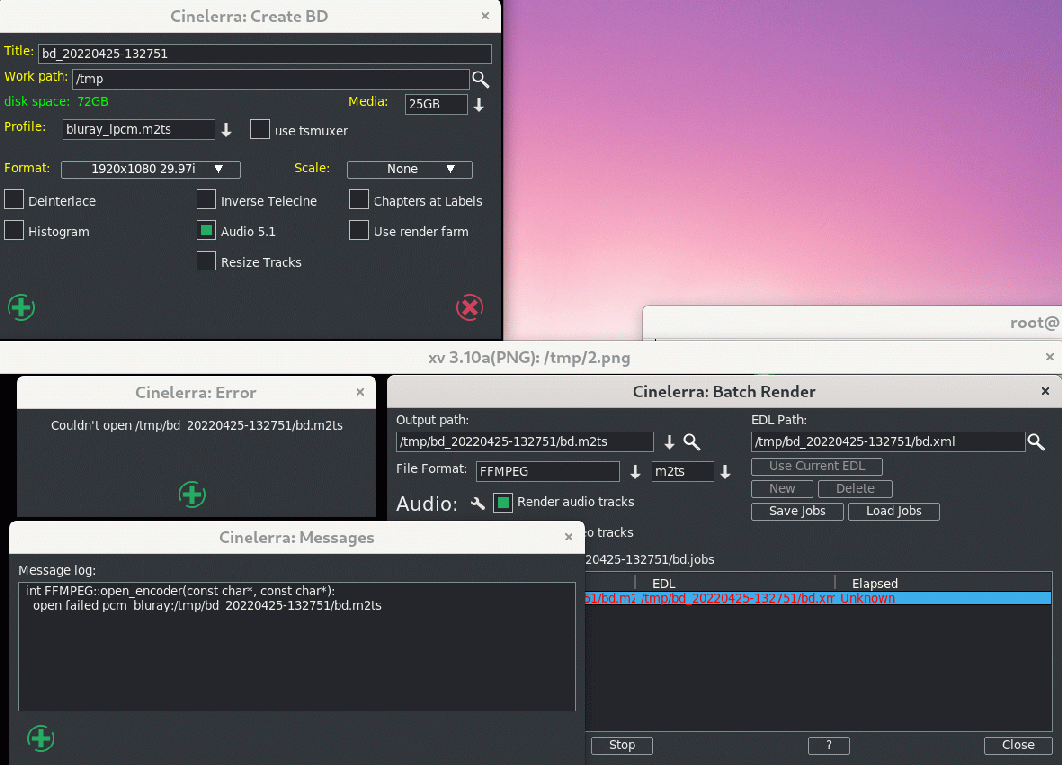 Files - bd.m2ts, bd.meta, bd.iso, and bbb-1920x1080-cfg06.mkv test file - are at: https://cinelerra-gg.org/download/testing/tsmuxer_ problem_files.tar My guess of whether or not they will execute the AppImage (link below) is below 1% probability: https://cinelerra-gg.org/download/testing/cin-x86_64.AppImage