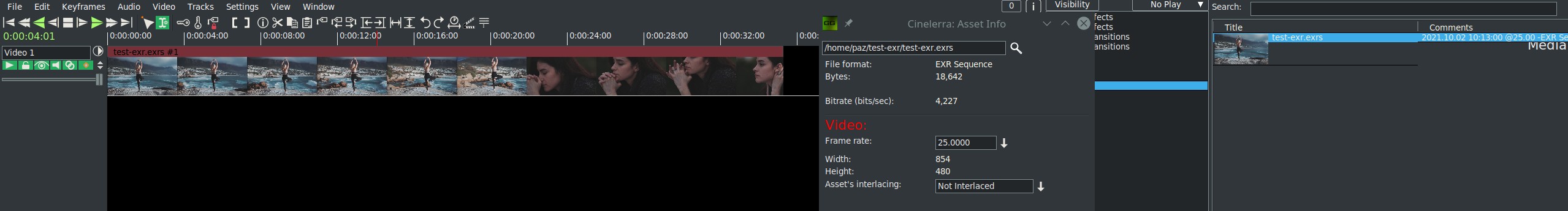 The TOC file is imported without errors but is misidentified and does not carry over the images. On terminal: FFStream::decode: avcodec_send_packet failed. file:/home/paz/test-exr/test-exr.exrs err: Not yet implemented in FFmpeg, patches welcome [...] Now I understood my mistake: creating an EXR sequence is done not with ffmpeg engine, so also the import must be done not in ffmpeg. With the option "Try FFmpeg last" everything works fine. The same with the PNG sequence. See image. Thanks, Andrew!
