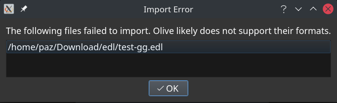 Preface: I do not use and do not know how to use other NLEs than CinGG. I installed them just to see their functionality and updates. Kdenlive creates an edl (even though it calls it .xml) via OpenTimeline. This doesn't work for me on either Kdenlive itself or Olive (which uses OpenTimeline). The error is that the format is not recognized. DaVinci Resolve creates an edl file that is not recognized in Kdenlive and Olive. Even inside DVR itself it is opened but it doesn't work. Anyway I don't know how to use DVR so it's sure that I'm wrong in something. The DVR edl is recognized in Openshot, but it doesn't open it because it can't find the original source. Again, I don't know how to do this. See the files at: https://www.dropbox.com/s/8nau5lvn7ymrgqr/edl.tar.gz?dl=0