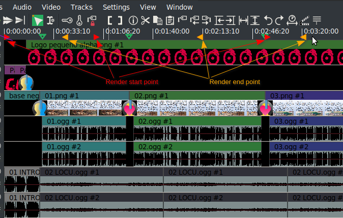 It would be nice to add these lines in the tips, since this is a great rarity and people should know it ... so they don't get frustrated with this wizard. I keep thinking, is it possible to add a button (Help) that opens a short pdf about the use of this tool? I could make this pdf, with very little text and explicit images on how to use it. It really is very unintuitive, but I think that any user with a few lines is going to take advantage of this tool. The playhead thing is something very strange and that people should know ... this should be an option in the wizard interface, it does not have to be hidden, such as the ones of Save EDL and that of the projects if they coincide or not. Something like that: □ Render from the position of the play cursor (or cursor of insertion) Can you do something like that, is it easy? Would Phyllis allow it? This simple option would stop this feature from being something that many users see as a wizard bug. And former users would simply have to enable this option. If I have to extract parts of a video I use Avidemux, because of how simple and fast it is, but I liked the selections to extract parts of a project in a batch, it is a shame to have to make an xml for each fragment when You could add the option I mentioned in another email, or create new render marks, which would go in pairs, label render start, label render finish, and be able to define the desired fragments with these labels, or as I indicated with the points of input and output and the time code in the render. Although I understand that this could be too much work for you. These labels that I quote usually carry these icons: ▶ = for the beginning of the render, ◀ = to indicate where it ends. (I hope your unicode setup shows the correct characters) But just in case I make an image. [image: 42.png] In the event that only a beginning mark is indicated, the render will be made from this mark at the end, if only the final mark is indicated, then from the beginning of the project to this mark. These marks may or may not be visible from the "Show Overlays" window as "Render Marks" and in the batch render window, an option: □ Use render marks ▶ ◀ (insert render labels). A new section could be added to the edit menu: Labels ... Insert generic label l Label of Render - Start Label of Render - End In the Render window under the option to use render marks there could be icons to insert these labels. ▶ ◀ Maybe it is too much work to do something like that, I wish I had programming knowledge and could help. For me, the important thing now would be the option cited for the position of the cursor and a help button that opens a short pdf that would be attached to the Cinelerra installation files and can be in English if there is no translation or in local language if someone translates them. I could do the English, Spanish and French (Although both in English and French someone native should review them). I repeat that it would take very little text. Greetings Andrew and thank you very much for your excellent work. El jue, 21 ene 2021 a las 15:52, Andrew Randrianasulu via Cin (< cin@lists.cinelerra-gg.org>) escribió: