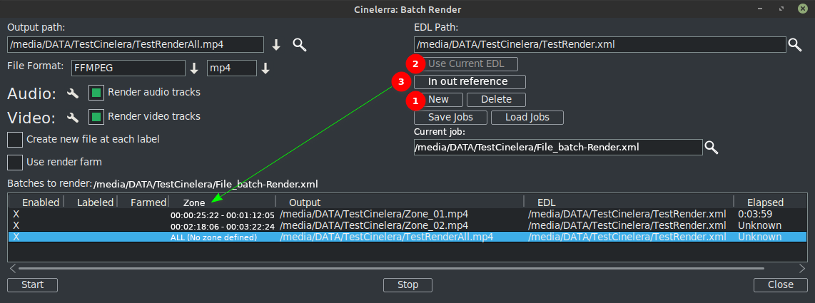 This collects the time code information of the current position of the entry exit points. If we move these points to another section and repeat the three previous steps, new, will always create a new line with ALL (project), this will render the whole project, but if we have moved the marks in out, and