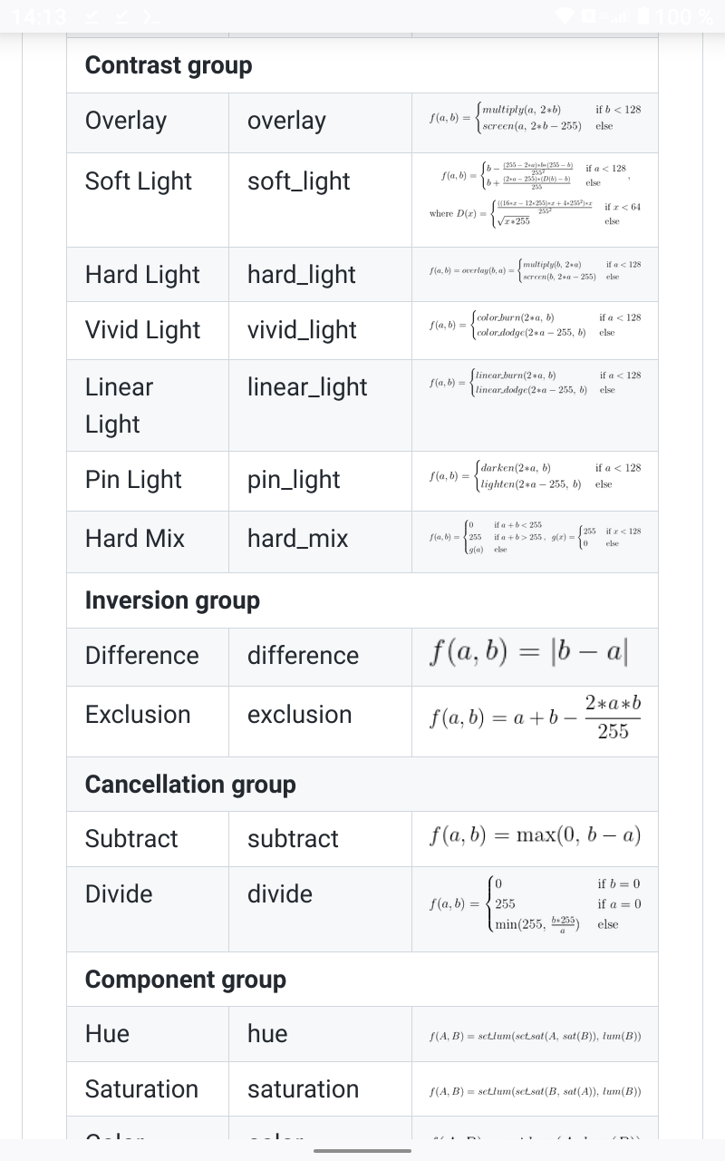 So, as Igor noticed CinGG's divide and subtract modes do not behave like they behaved in Cin HV/CV/CVE I digged into matter a bit and found few confusing (for me, amateur) things. First, it seems CinGG as of now implement divide mode just like Natron (2.5 from git). https://paste.pics/JJC90 But GIMP/Krita/Photoshop implement different algo, probably described here: https://github.com/psd-tools/image-blender/blob/master/wiki/Blend-modes-and-... basically it makes color white if one input (not one you divide to) was black. I think this is consistent with screenshot: https://paste.pics/JJC76 But moreover, according to documentation CinGG composites tracks a bit backward comparing to photo editors: Description The previous math forms are the only truly accurate description of each blending operation, but short descriptions are below where Source is the output from the next track and Destination is the output from the lower track stacking. Blending starts with new Source and combines it with the previous render stack output, which is referred to as Destination. The new output becomes the next Destination and the next up stack level becomes the new Source. Source is above; Destination is below. --- https://cinelerra-gg.org/download/CinelerraGG_Manual/Description.html So, in subtract and divide modes this *really* makes a lot of difference, like inverting (wildly altering) colors. By playing with automatically set keyframes I 'discovered' you can change compositing mode along the track - so this makes interesting dynamic effects possible. But I do not think reverting subtract/divide to their original form will be best solution. I hope another set of modes can be added, implementing at least previous algo, even if not exact ordering of compositing. (you always can swap tracks or use overlay plugin for different order?) I did similar (software-only ) patch ~year back, attached again (might need some tweaking for new sources). Problem is, I am a bit lost in this MACRO thing, so showing everyone how to put complex equation into our current overlayframe.h very much hoped for. Of course more ultimate idea is to put user-editable inputbox somewhere there, yet I not dare to think what will happen if user just added some A/B and B happened to be zero ..... at runtime, due to picture (so, macro somewhat must wrap around existing checking macro, and THIS definitely above my level ) https://git.cinelerra-gg.org/git/?p=goodguy/cinelerra.git;a=blob;f=cinelerra... One the bonus side, I made simple PSD file in GIMP (2.10.32) and it was openable in cingg via ffmpeg's decoder! of course I am not sure if ffmpeg ever will expose raw layers and metadata for making more complex composition work in applications using it possible, but hey, who knows the future! attached even screenshot from psd-tools repo because I am a bit paranoid about information disappearance ....