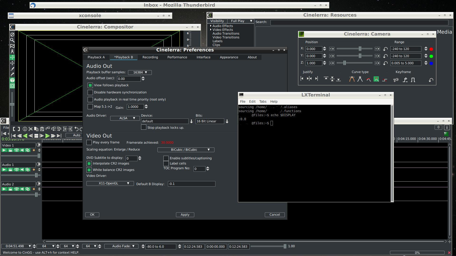 well, I send ALL windows once to second monitor by playing with main window menu items 'Send windows left/send windows {to monitor} Right' but then getting them back was impossible without editing Cinelerra_rc on cingg compiled 1 nov 2020, so if it was a regression it was not very recent one? I used just X -configure (X version 1.19.7) as root inside qemu VM launched as described above, then copied xorg.conf.new to /etc/X11/ as xorg.conf and made sure there was no files in /etc/X11/xorg.conf.d X started with kde 3.5.10 on both screens (not sure if fluxbox handles this...?) so I guess adding printfs to print what each window get as DISPLAY argument will be next step ....