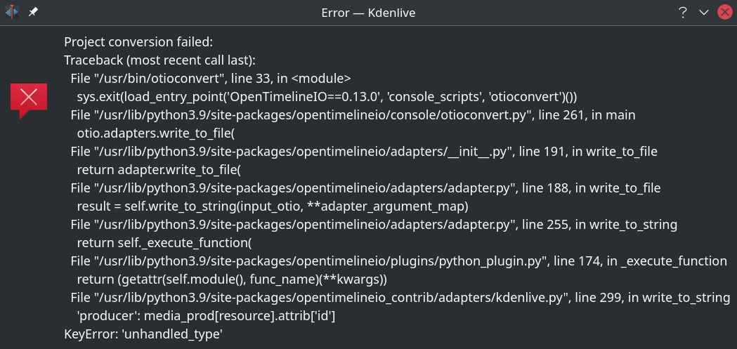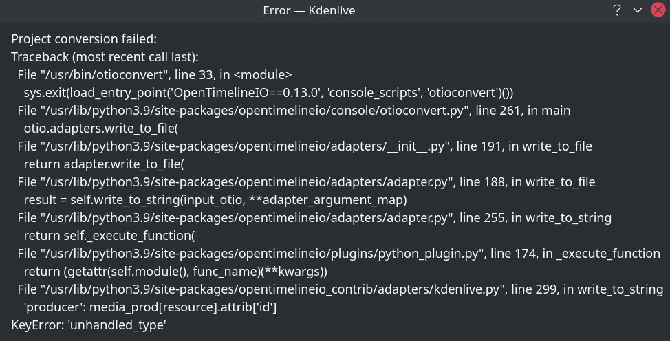 it looks like kdenlive can't load its own adapter? may be OTIO/Kdenlive/python mismatch?