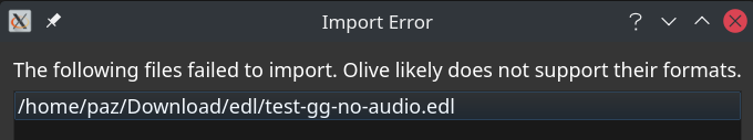 1- I created 2 projects in mp4 and ProRes. I exported to EDL CMX3600. Imports into other programs seem to improve, but always end in error: In Kdenlive I no longer have the generic error I had before, but I do have python errors; see images. In Olive same error as before; see image. In OpenShot it can't find the original source and it doesn't open (as before), but it gives the idea to recognize the format. 2- I imported in CinGG an mp4 at 120 fps, edited it with cuts, ffmpeg filters and transitions; then I rendered in DNxHR_proxy.mxf. All OK. I imported the files in other NLEs: all OK. I played them in different players: all OK. (but also in the preceding tests I had not had problems).