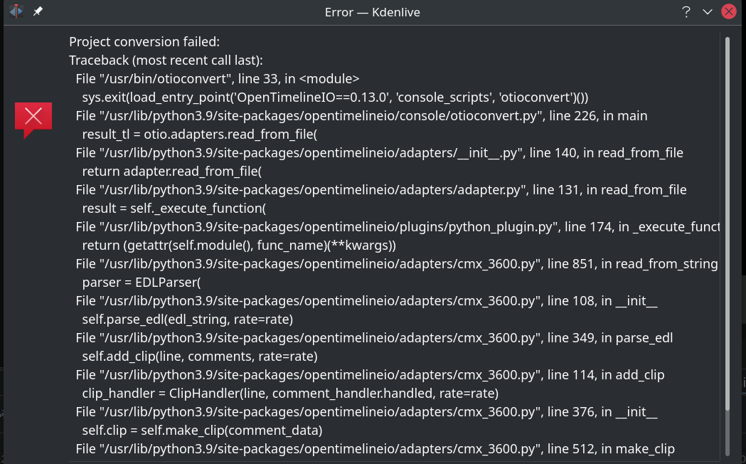 1- I created 2 projects in mp4 and ProRes. I exported to EDL CMX3600. Imports into other programs seem to improve, but always end in error: In Kdenlive I no longer have the generic error I had before, but I do have python errors; see images. In Olive same error as before; see image. In OpenShot it can't find the original source and it doesn't open (as before), but it gives the idea to recognize the format.