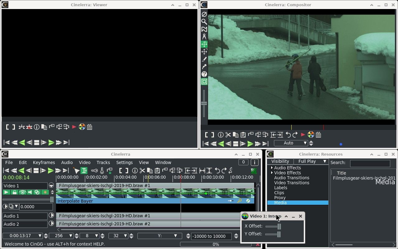 I try to play this new .braw firmat using slightly modified ffmpeg patch from https://patchwork.ffmpeg.org/project/ffmpeg/patch/ 20191214115705.25497-1-onemda@gmail.com/#49278 test file #2 from (~500 mb, full hd, 13 sec) https://filmplusgear.com/blackmagic-raw-braw-testfile-for-download/ I can't see it automatically de-bayering data, so I used "interpolate Bayer" plugin. It works slooowly in software... {1.3 fps} And parameters not obvious. I think those coeffecients explained in https://github.com/rasmus25/debayer-rpi/blob/master/debayer.cpp // BGGR = 0,0 // GRBG = 0,1 // GBRG = 1,0 // RGGB = 1,1 because my bayer_rggb16le file now looks more correct with Interpolate Bayer controls set to 1/1 but can anyone test various raw bayer videos to see if it holds true?