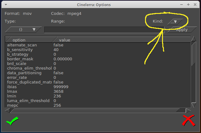 In Render-> ConfigureVideo(Audio)Compression-> VideoOptions: View, the "Kind" PullDown button shows three point. Is it right? The options are "codec" and "ffmpeg". Thanks